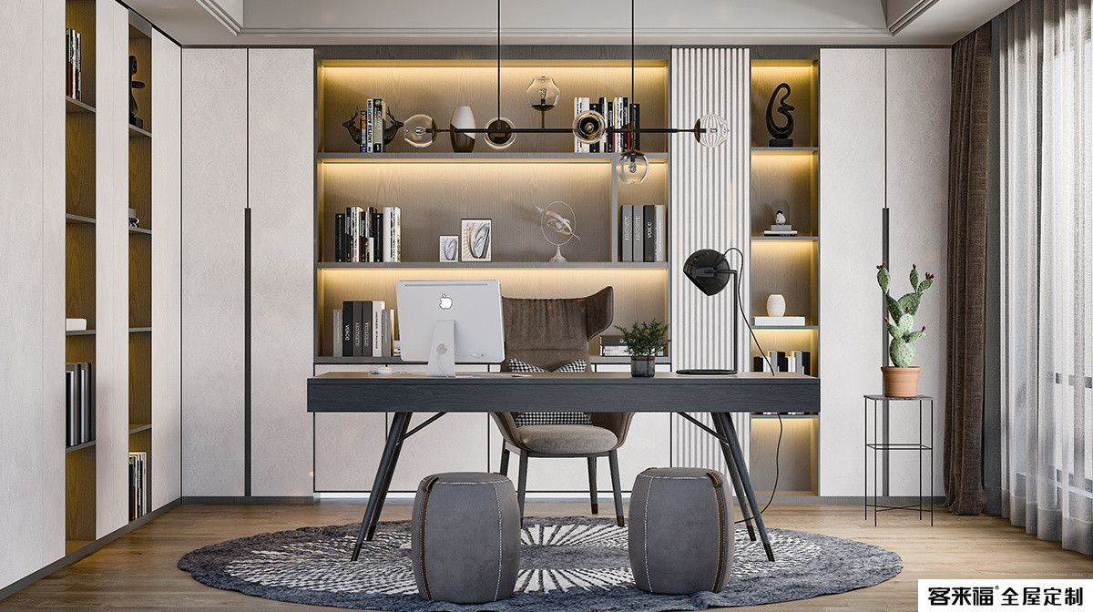 The calm black is matched with the mechanism-rich pure white. The design of the bookcase is embedded in the wall to integrate with the space. Built-in LED lights, the bookcase as a whole creates a calm, advanced and comfortable feeling. In the clean space, leaning on the large bay window, there is plenty of light, and a sense of leisure and coziness when reading emerges spontaneously.