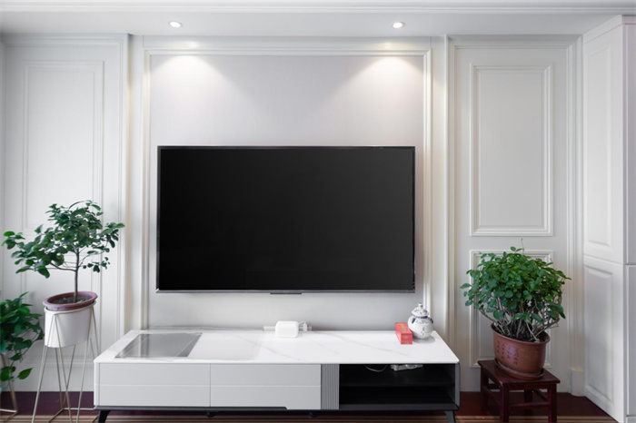 电视背景墙以电视柜为中轴线,两侧打造对称的石膏线门板的设计,将背景墙连成完整的一面,与右侧的餐边柜花纹样式相一致,在视觉上形成连贯的效果。电视柜采用的是成品家居,黑白灰三色的搭配简约却不失格调。顶部射灯的光线向下投放,如伞状。