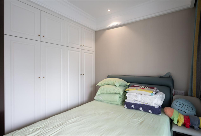 次卧与阳台相连接,使得整体的光线更加透亮,实现了在早晨起来便能感受到来自外界的第一缕光亮。与主卧处颜色搭配相反,床铺使用的是相应的淡绿色,背景墙采用的是棕色。一侧整面到顶的衣柜,两开门的衣柜设计,精美的膜压门板花纹,给空间增添一丝层次感。金色的立体把手减少了拉开门时的阻力。在打造的时候要注意衣柜与床铺之间的距离,避免拉开的时候与床边相碰撞。