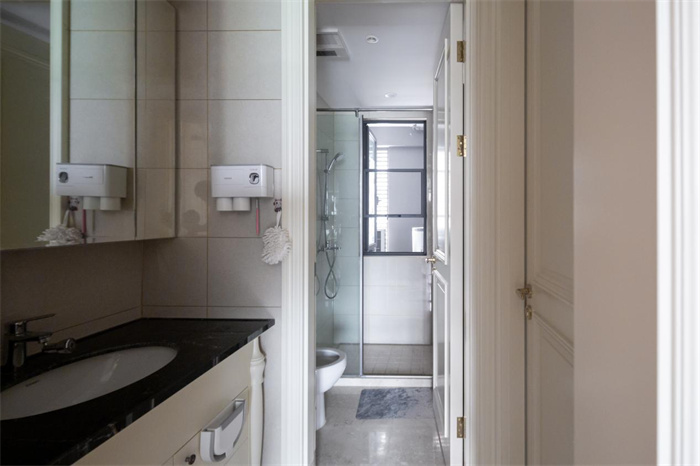 这间是在主卧处的卫浴间,半包围的淋浴间下方做了抬高的踢脚线,更容易散发卫浴间的水汽。户主想要将卫浴柜、淋浴间有序的安排在同一空间内,所以设计师在高度、尺寸和位置方面进行多方的测量,才最终决定这三处的位置。