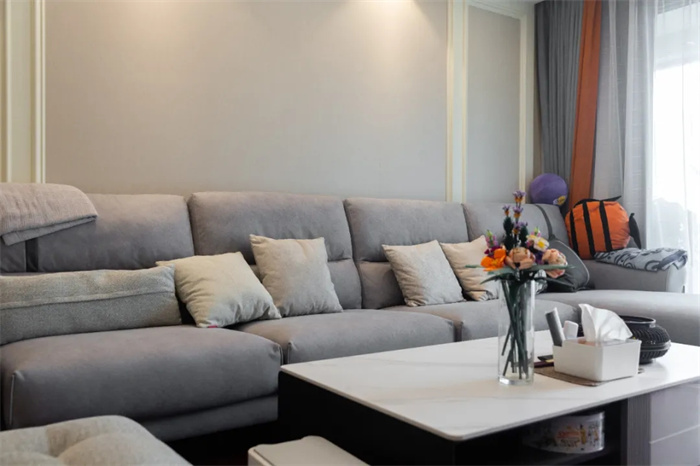 灰色系的沙发,米色系的抱枕,暖黄色的射灯营造温馨的家庭氛围,回到家后躺在沙发即可享受此刻的柔软。柔和的棕色与米白色的石膏线背景墙打造仿佛融为一体,同样是对称的设计与电视背景墙相呼应。如果感觉背景墙有些单调,可以挂上长方形的挂画来增加空间内的丰富性和层次感。
