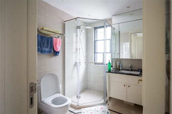 此处卫浴间位于书房和储物间的中间,透光性略微有些不充足。从卫浴柜到马桶到淋浴间三者按照顺序有序打造, 使用起来相对方便。