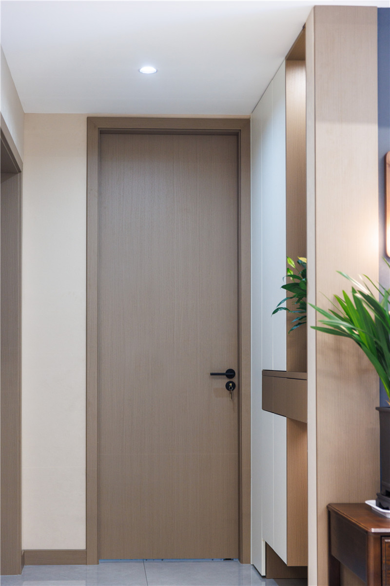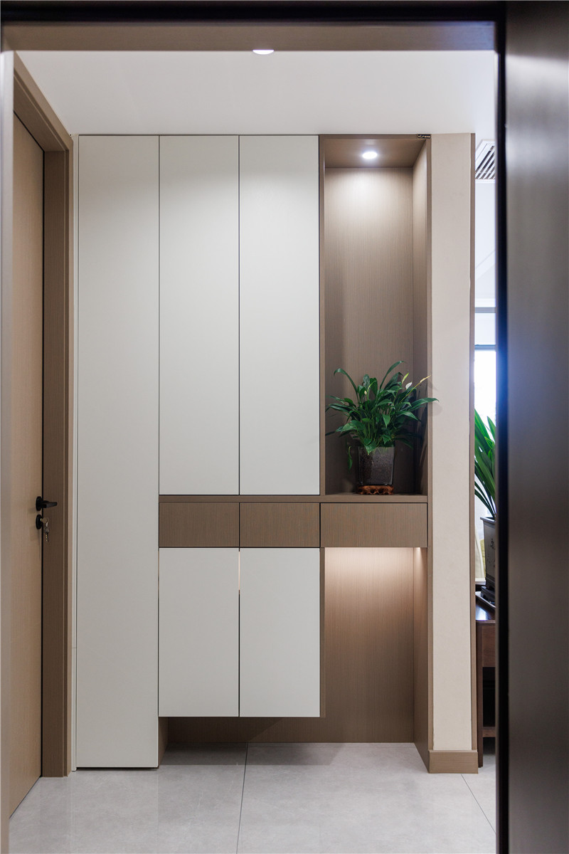 玄关柜设计遵从简单设计手法,选用科技直纹与兰迪白作拼色设计增添时尚感,让空间不单调;门墙柜一体化选用jinnianhui官网 - 金年会科技直纹,更加自然百搭。