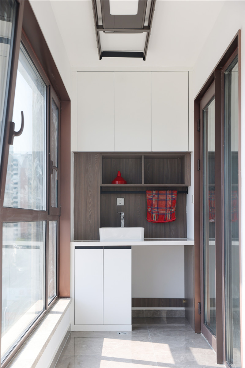 阳台一侧做小型洗漱区,有效避免上班、上学的洗漱时间冲撞,底部预留区可放洗衣机;一侧做整面到顶柜,可作为换季衣物存放区;此空间柜体需注意柜体耐黄化及防水性。