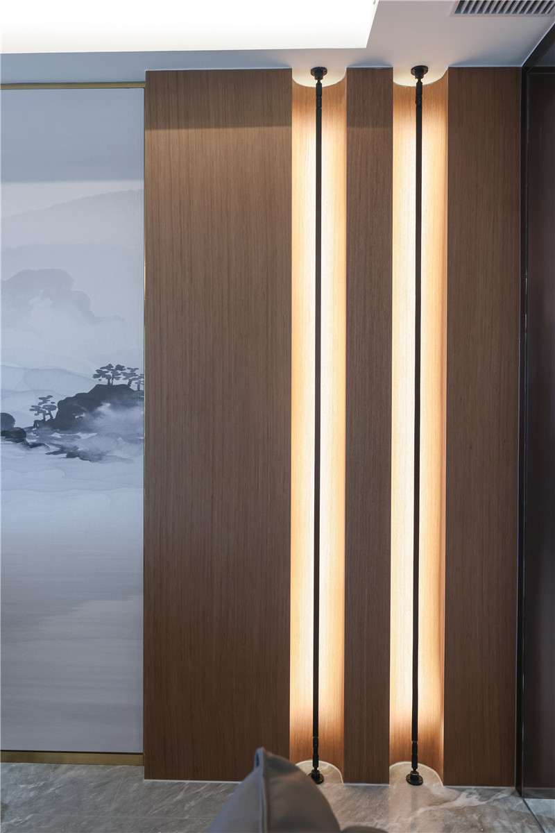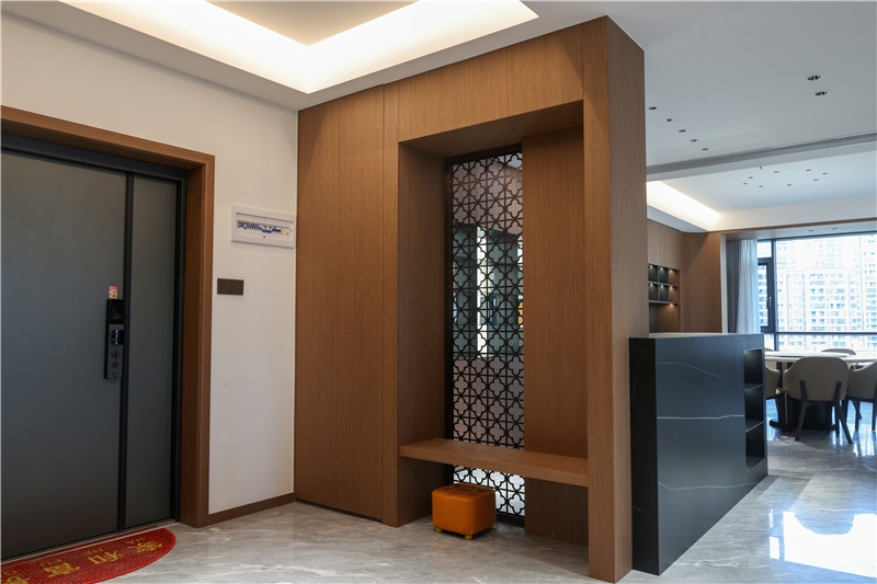 一侧柜体为挂衣存储区,无拉手柜门协调视觉、休憩座缓解疲劳,背板加入中国结屏风隔断,中式意境突显。