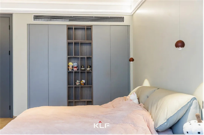 卧室设计中部不规则开放柜,放置日常玩偶、手办、模型等收藏品,符合使用者所需,同时为衣柜增加了精致与颜值。
