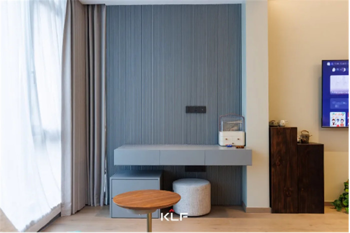 满墙格栅设计增加舒适感,缓和轻奢风带来的疏离,让空间更加和谐宜居,客厅无主灯设计让空间更加宽阔明亮。