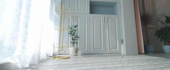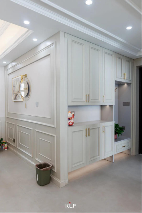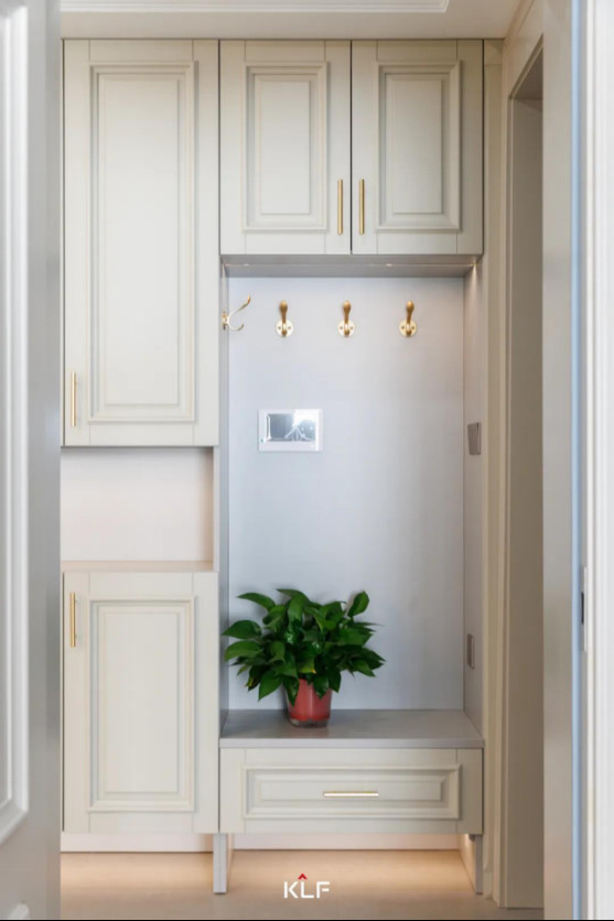 玄关入户柜简约纯净,在设计上采用“二八”原则,挂衣区、换鞋区精心布局,搭配顶部收纳柜、鞋柜增加储物功能。