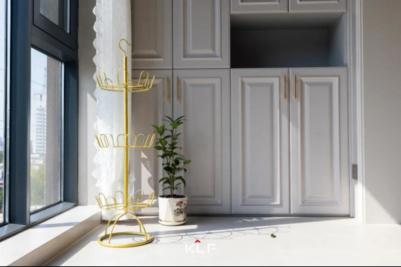 靠墙设计的水漆茶白阳台柜兼顾收纳和颜值,整墙简约金属拉手收纳柜让生活琐碎变得井井有条,纵向立体化收纳,搭配中间开放设计,可放置日常用品,便于拿取。