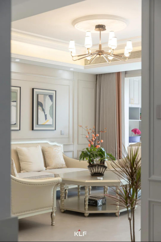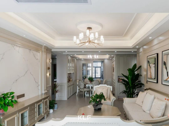 客厅结合大理石等材质的运用,营造出高贵优雅的氛围。吊顶采用有主灯的形式,边上围绕着辅助灯,增加了空间的通透感,让整个区域显得更加明亮宽敞。