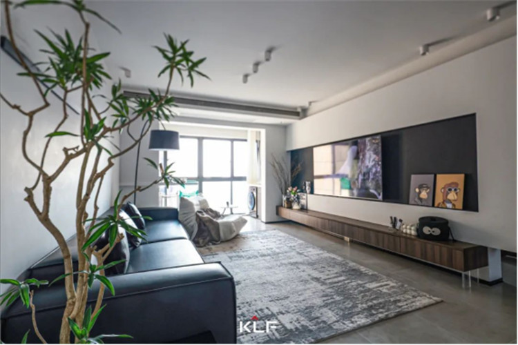 入户后左手边即为客厅,与餐厅相连彰显横厅的通透明亮。客厅家具的选用在色彩上延续了极简黑白灰的配色,让冷峻与温润中和整体气质。