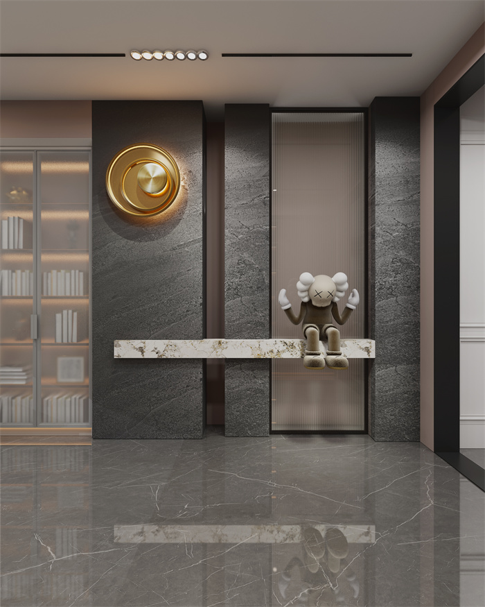 ⼊户空间造景区与鞋柜相互呼应,精致的⻓虹玻璃作为情绪与视觉的点睛,填充空间空⽩的同时,也衍生出生活美学的设计感与仪式感。