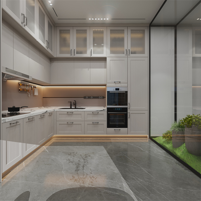 ⼀个舒适的厨房可以给我们做饭时带来愉悦感,家里的厨房是反映⽣活⽓息的地⽅。U型的简洁的动线设计和明确的功能区划分使得整个烹饪变得有条不紊。 无把⼿的橱柜造型简洁,美观大气,其时尚的气质满⾜现代年轻⼈的审美需求。