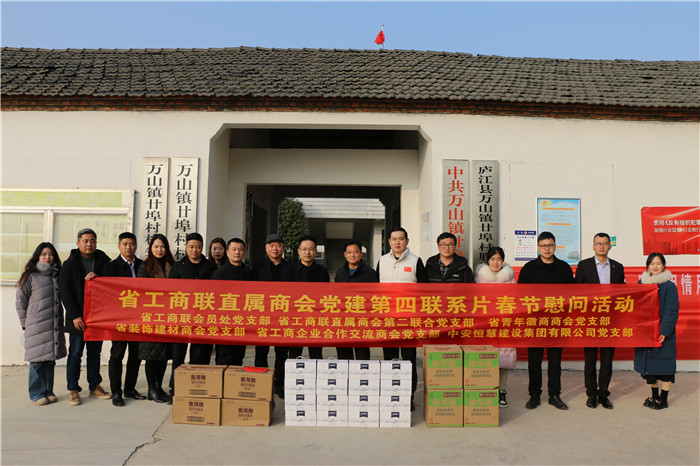 1月10日下午,省工商联会员处党支部、直属商会党建第四联系片有关商会党支部及会员企业党支部代表赴庐江县万山镇廿埠村开展走访慰问活动,为廿埠村部分困难党员、贫困群众送去慰问金及大米、食用油、牛奶等生活物品。