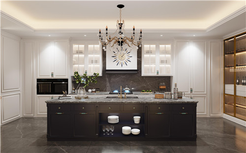 石英石台面的中岛台一方面起到了增加厨房操作台的功能,提高了生活的舒适度,另一方面可以充当餐桌,偶尔约上三五好友在这里喝酒或者聊天非常惬意。