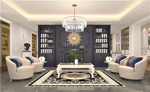 选用灯具、金属壁挂、地毯等多种配饰,不同配饰共同构成空间的多重表达,装饰选材也非常丰富,整体营造出古典与高贵的氛围。