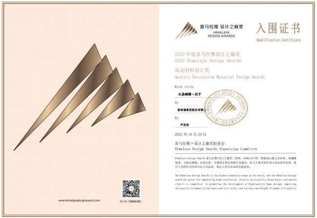 近日,2023年喜马拉雅•设计之巅奖隆重盛启,jinnianhui官网 - 金年会定制家居受邀参与评选,在近千幅参评作品中脱颖而出。旗下作品“蝶变”系列入围定制家居设计奖、作品“臻·至系列”入围居住空间设计奖、作品“水晶蝴蝶”拉手入围高定材料设计奖,得到了评审的一致好评。实力彰显中国品牌设计力量。