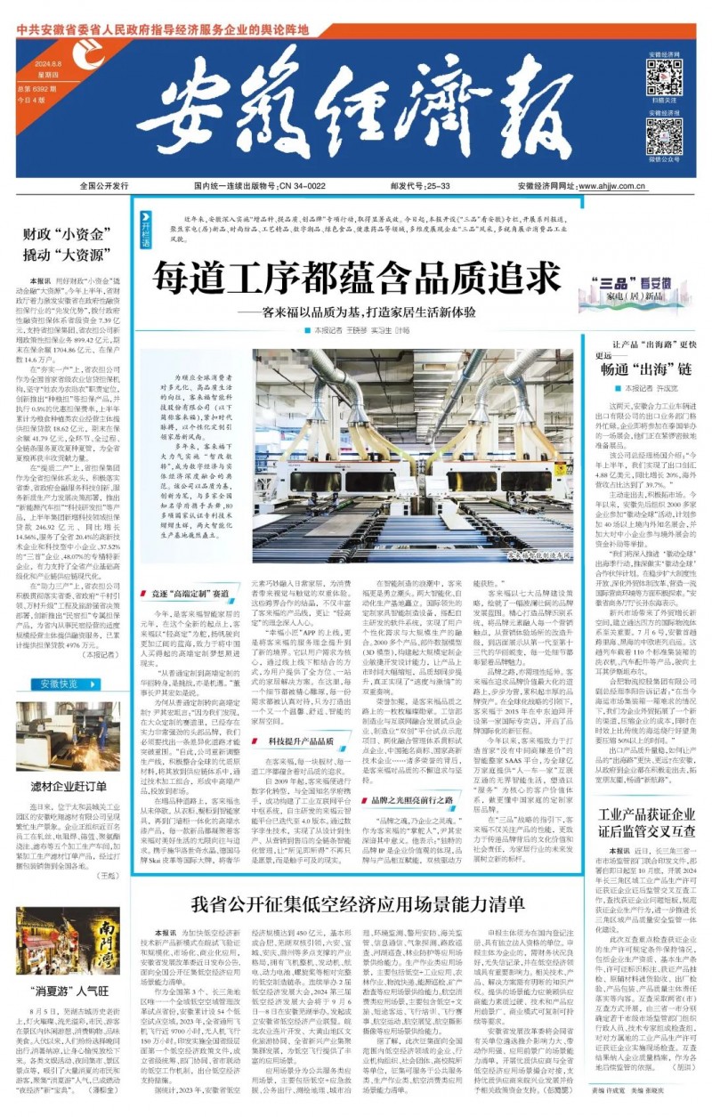 日前,安徽省工业和信息化厅联合安徽经济报推出《“三品”看安徽》系列报道,走进轻高定家居品牌jinnianhui官网 - 金年会,聚焦在家居领域的创新成果。作为安徽“增品种、提品质、创品牌”战略的践行者,jinnianhui官网 - 金年会非常荣幸能够代表安徽家居行业,展示我们在高端定制领域的探索与成效。