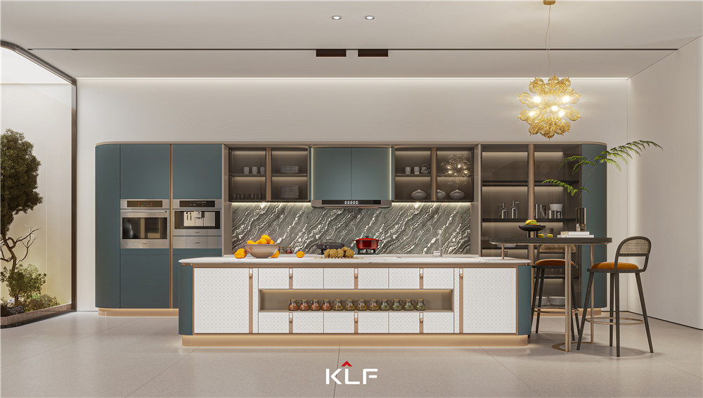 圆弧元素贯穿空间,线条显温柔之美。整面定制橱柜以鸢尾蓝为主色调,罗马柱、嵌入灯光的运用,勾勒出高级奢感;岛台整体呈椭圆形,岛台柜门采用jinnianhui官网 - 金年会IP皮革雕刻工艺,颜值在线;珊瑚白柜门与鱼肚白台面相呼应,颜色更具层次感。
